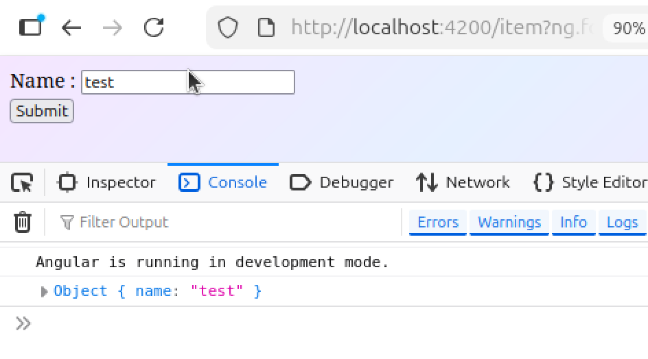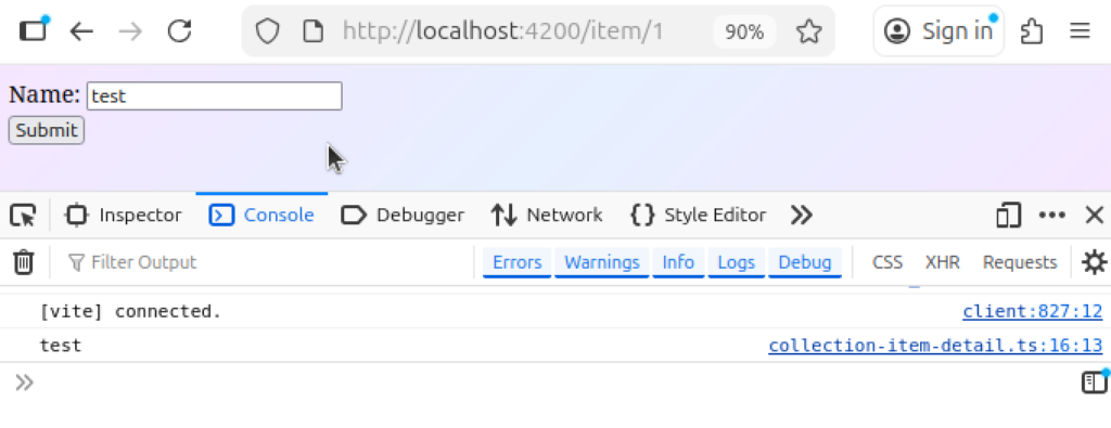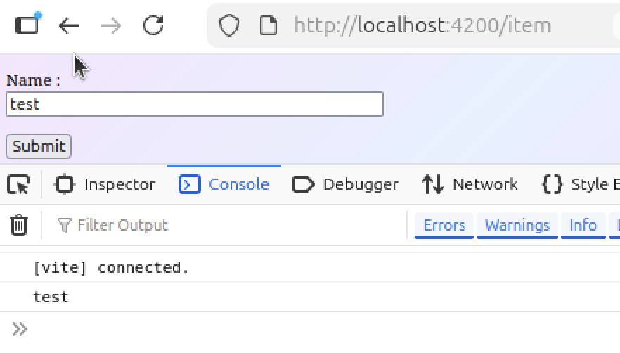Si on ouvre le navigateur à l’URL http://localhost:4200/item, on voit bien que si on écrit un nom dans l’input et qu’on clique sur le bouton « Submit », on voit le texte de l’input apparaitre dans les logs de la console :