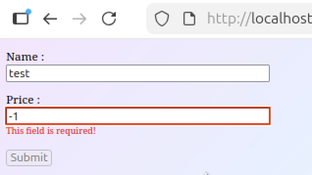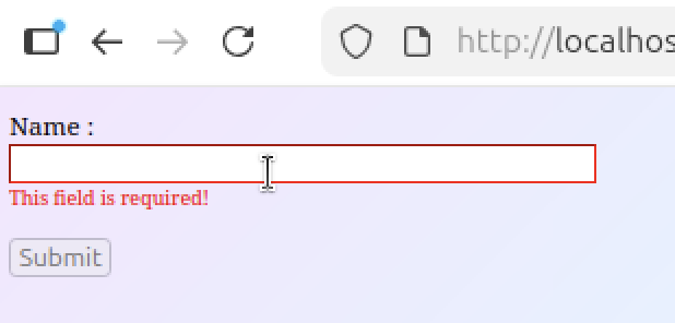 Si on veut rendre notre input obligatoire et ne rendre le bouton « Submit » actif uniquement si l’utilisateur à entré une valeur dans notre input, on peut faire la chose suivante :