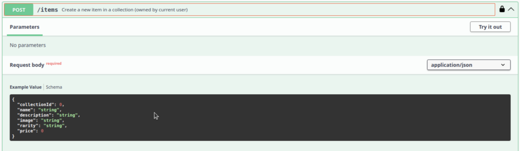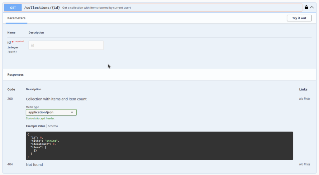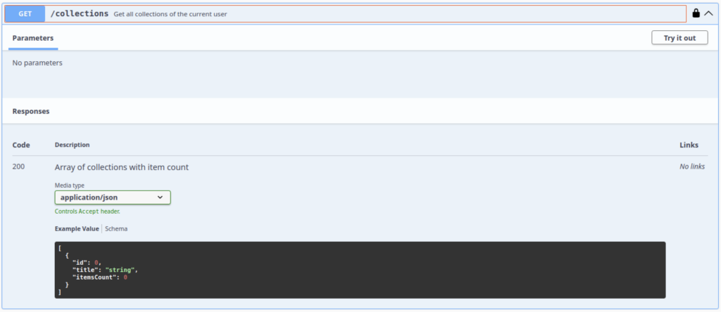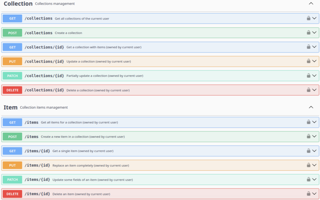 Ici, on peut voir deux ressources, collections et items avec plusieurs méthodes HTTP qu’on pourra utiliser pour interagir avec ces ressources. Pour chaque ressource, on trouve les méthodes HTTP suivantes: