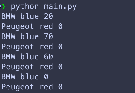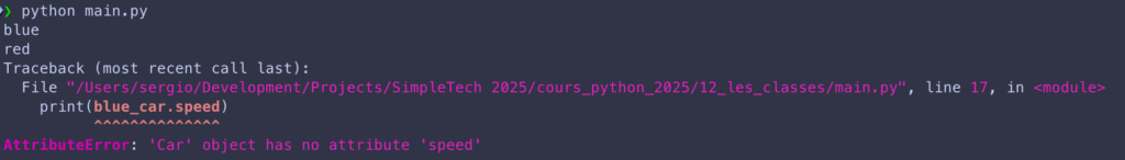 print(red_car.brand, red_car.color, red_car.speed)Maintenant, quand on lance notre programme, on observe la chose suivante :