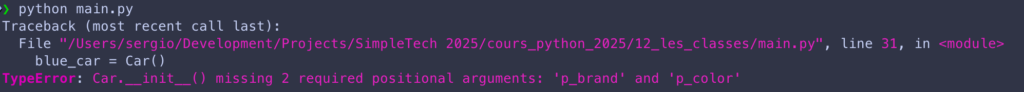 print(red_car.speed)Maintenant, si lors de la création de nos objets, on ne renseigne pas la marque et la couleur des voitures, on obtient l’exception suivante :